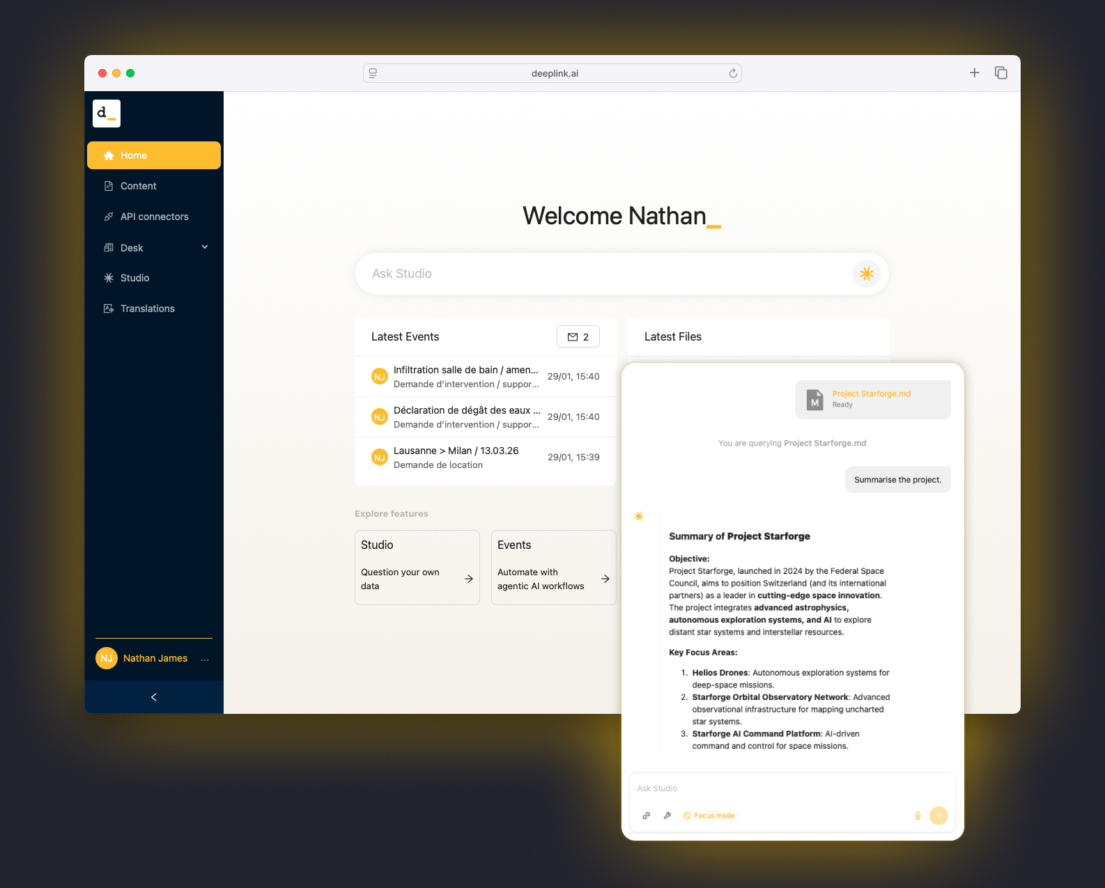 Toutes les données sont traitées et hébergées uniquement sur la plateforme de Deeplink – elles restent en Suisse.