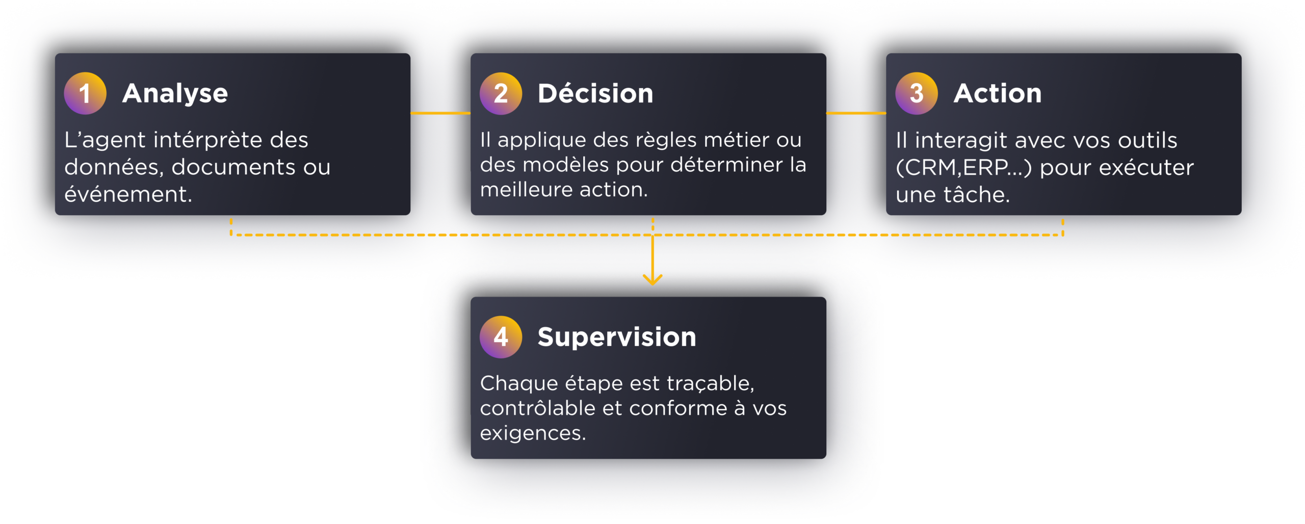 Des agents programmables selon vos besoins, qui dépassent l’assistance conversationnelle.