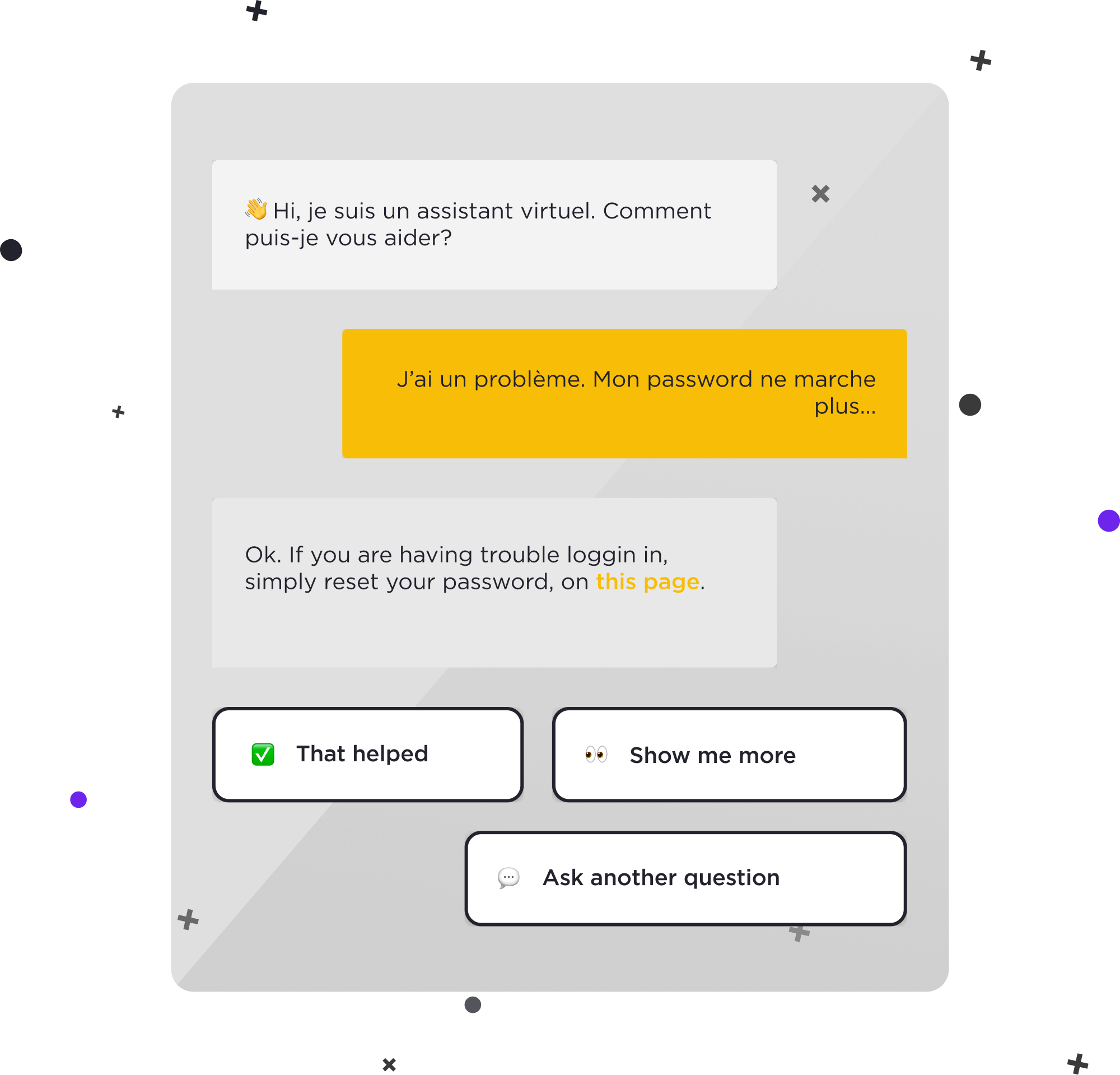 Atteignez vos clients, où qu’ils soient et dans la langue de leur choix. Notre plateforme intègre un moteur de traduction automatique ! Votre robot parlera plusieurs langues en quelques minutes, et vous pourrez à tout moment améliorer les traductions manuellement.