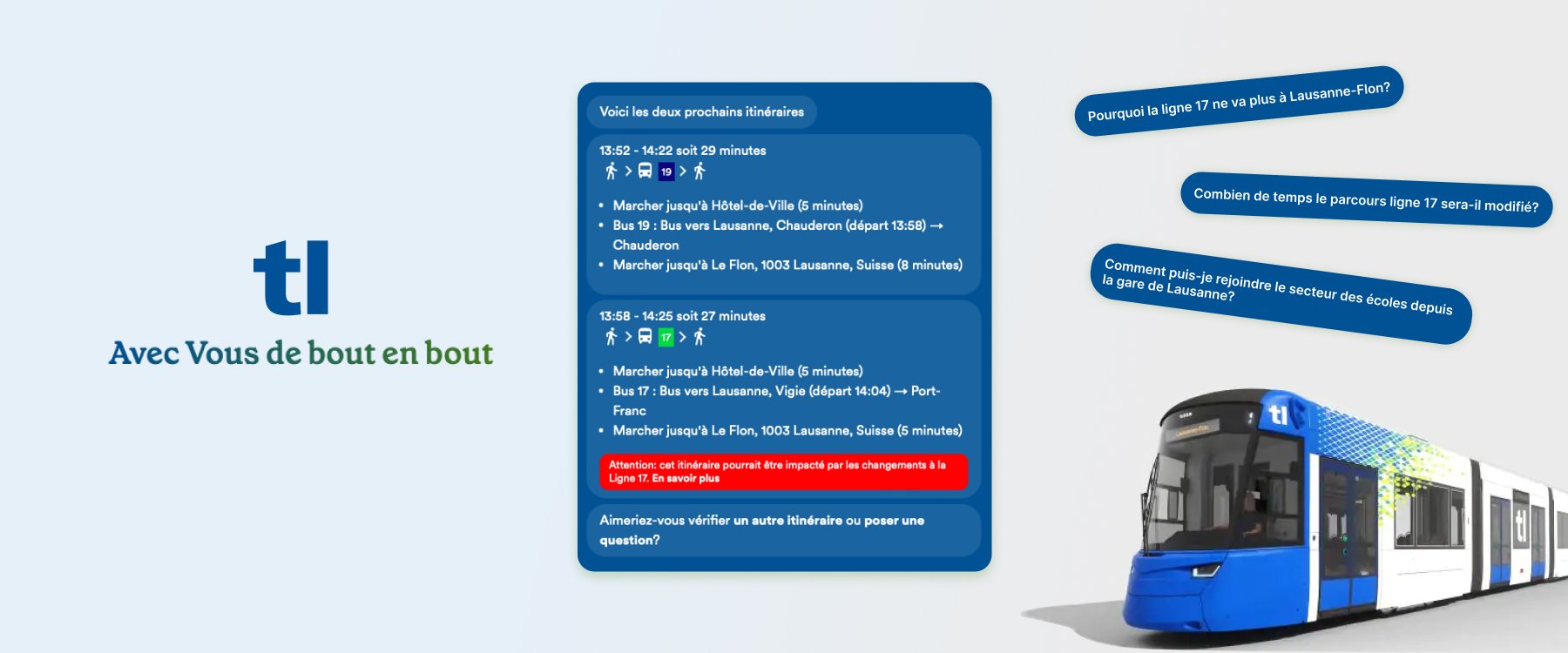 Depuis février 2024, les travaux du futur tramway empêchent les bus de la ligne 17 de desservir le tronçon Port-Franc / Lausanne-Flon. Afin d’accompagner les usagers à l’adaptation de cette ligne, Deeplink a créé un chatbot sur mesure. Propulsé par intelligence artificielle, l’assistant permet de vérifier si un itinéraire est impacté par le changement. Il offre surtout aux voyageurs l’occasion de poser des questions sur de nombreuses thématiques. Les réponses sont générées automatiquement à partir de la FAQ t-l.ch par notre module d’IA Document Search. Celui-ci se base sur les pages web et un ensemble de documents, pour sélectionner les contenus pertinents et construire une réponse sur un ton humain.